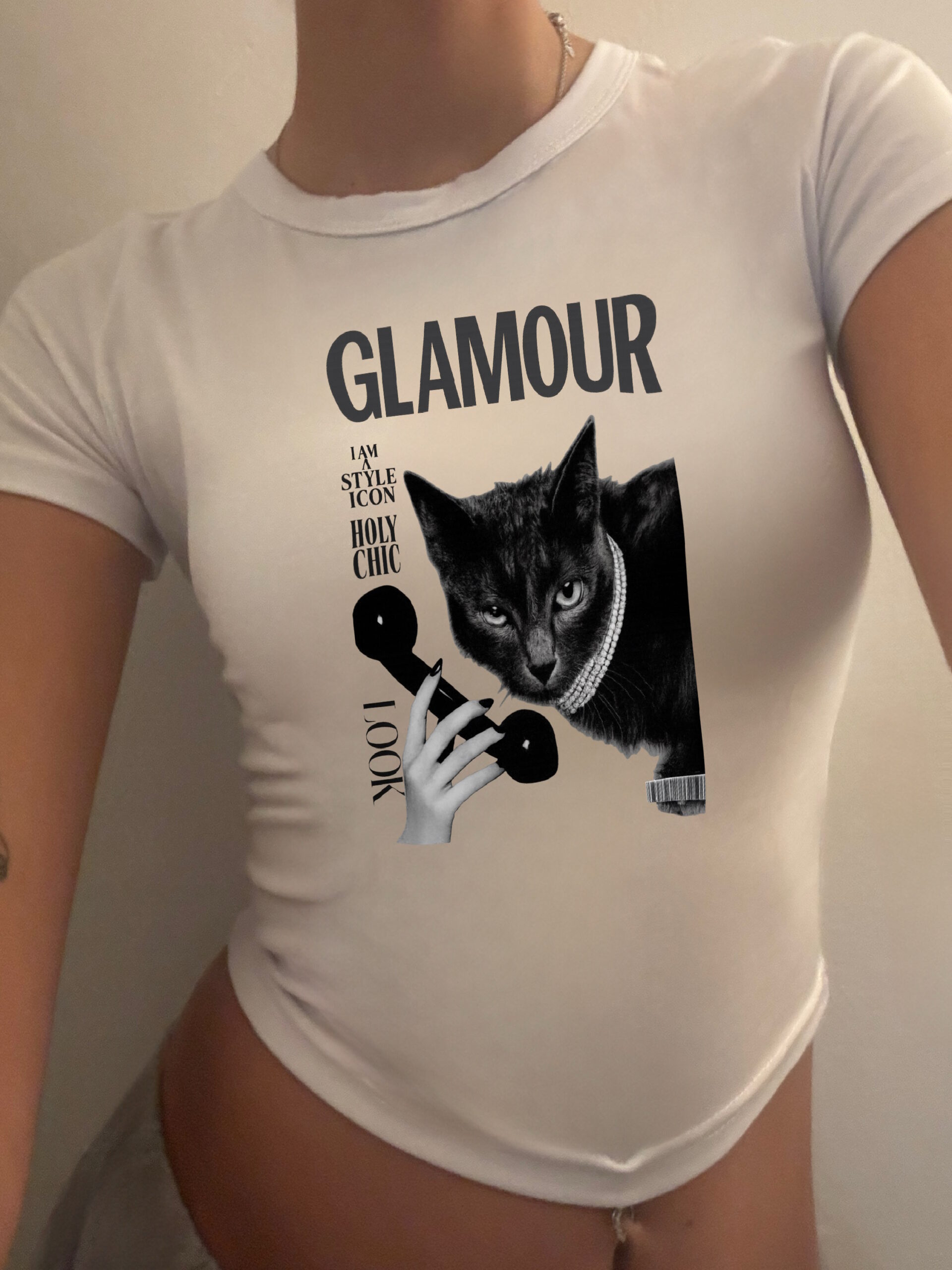 חולצת קרופ לבנה עם הדפס גרפי ייחודי בהשראת שער מגזין,